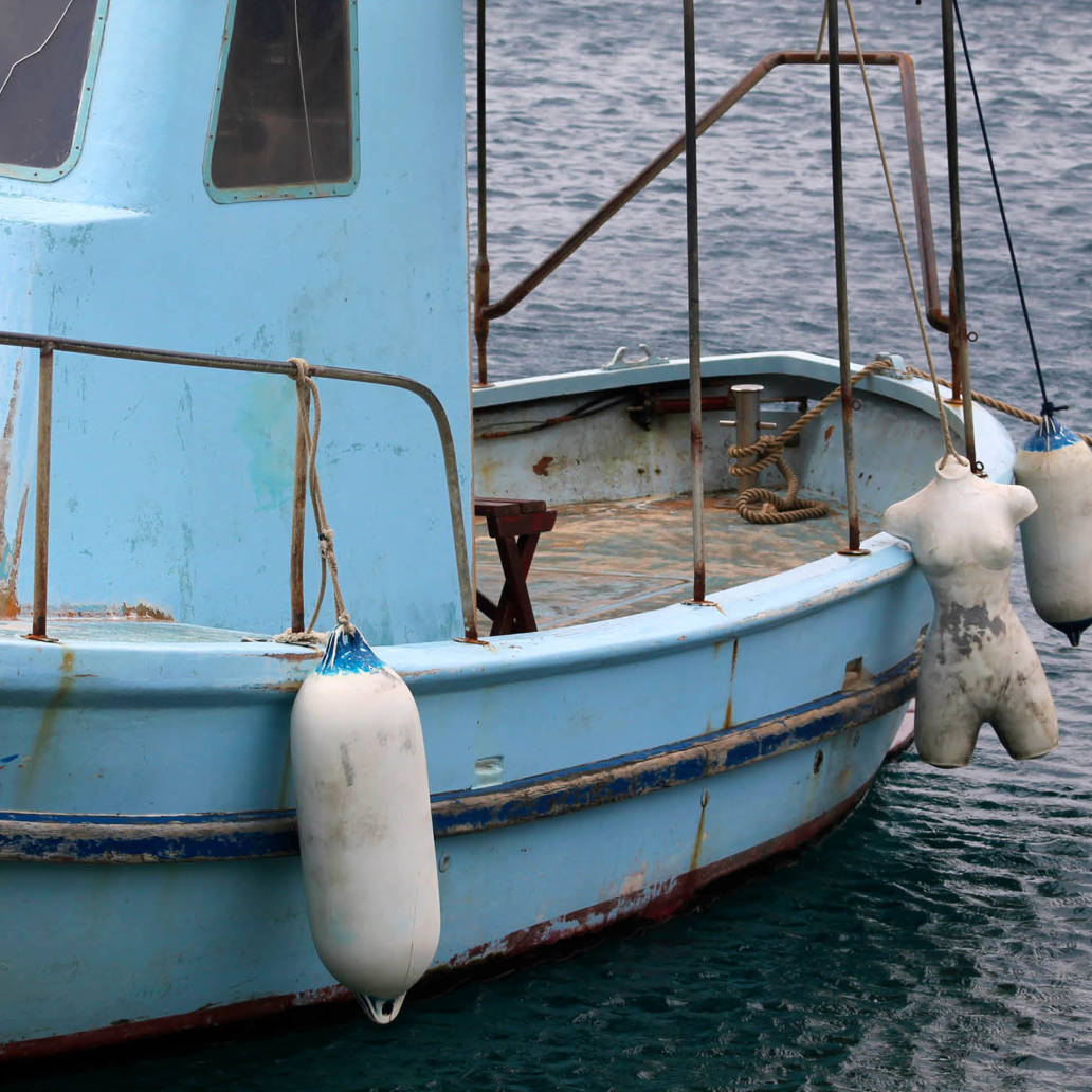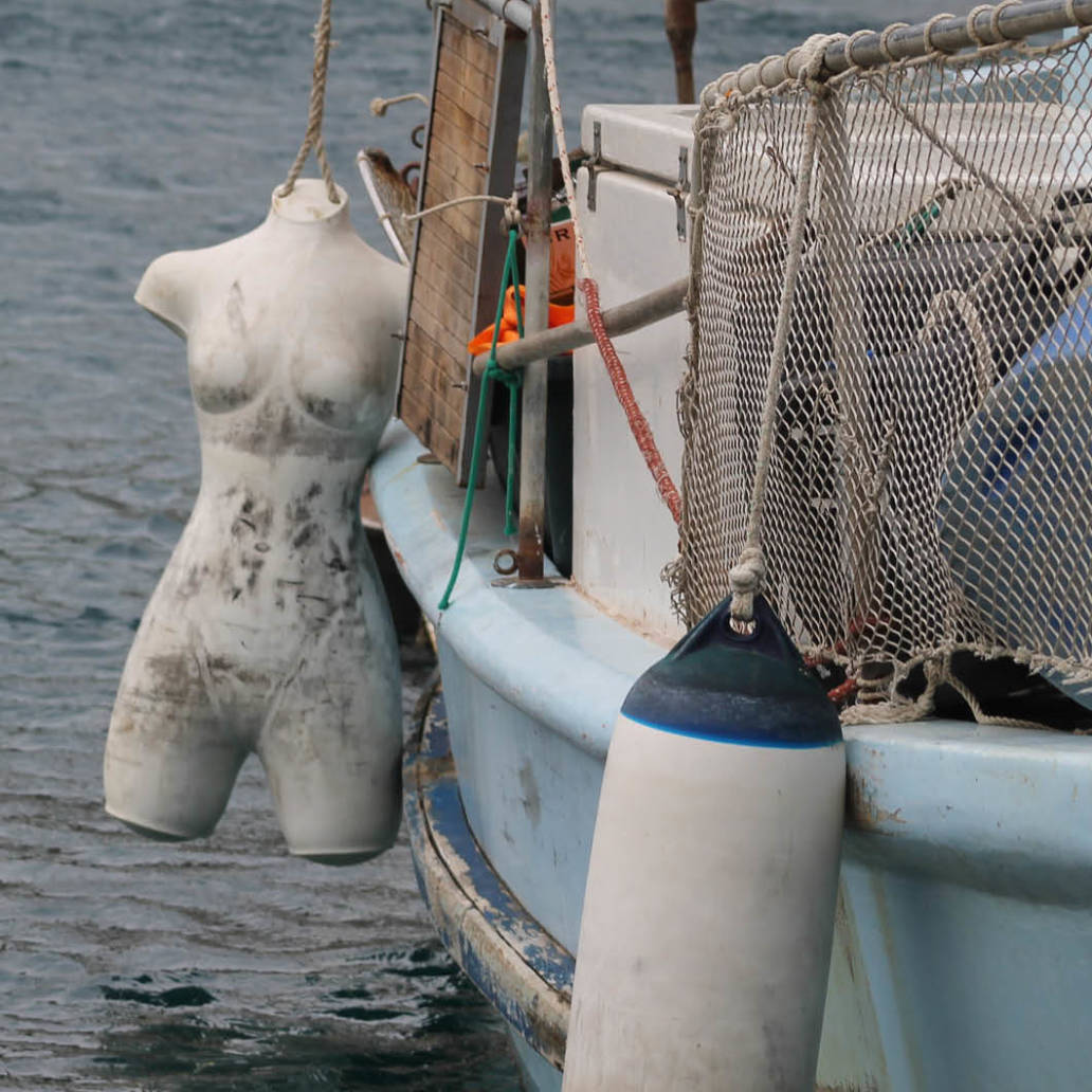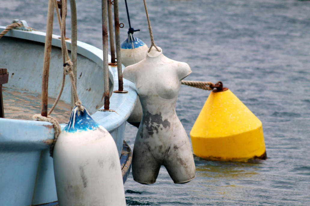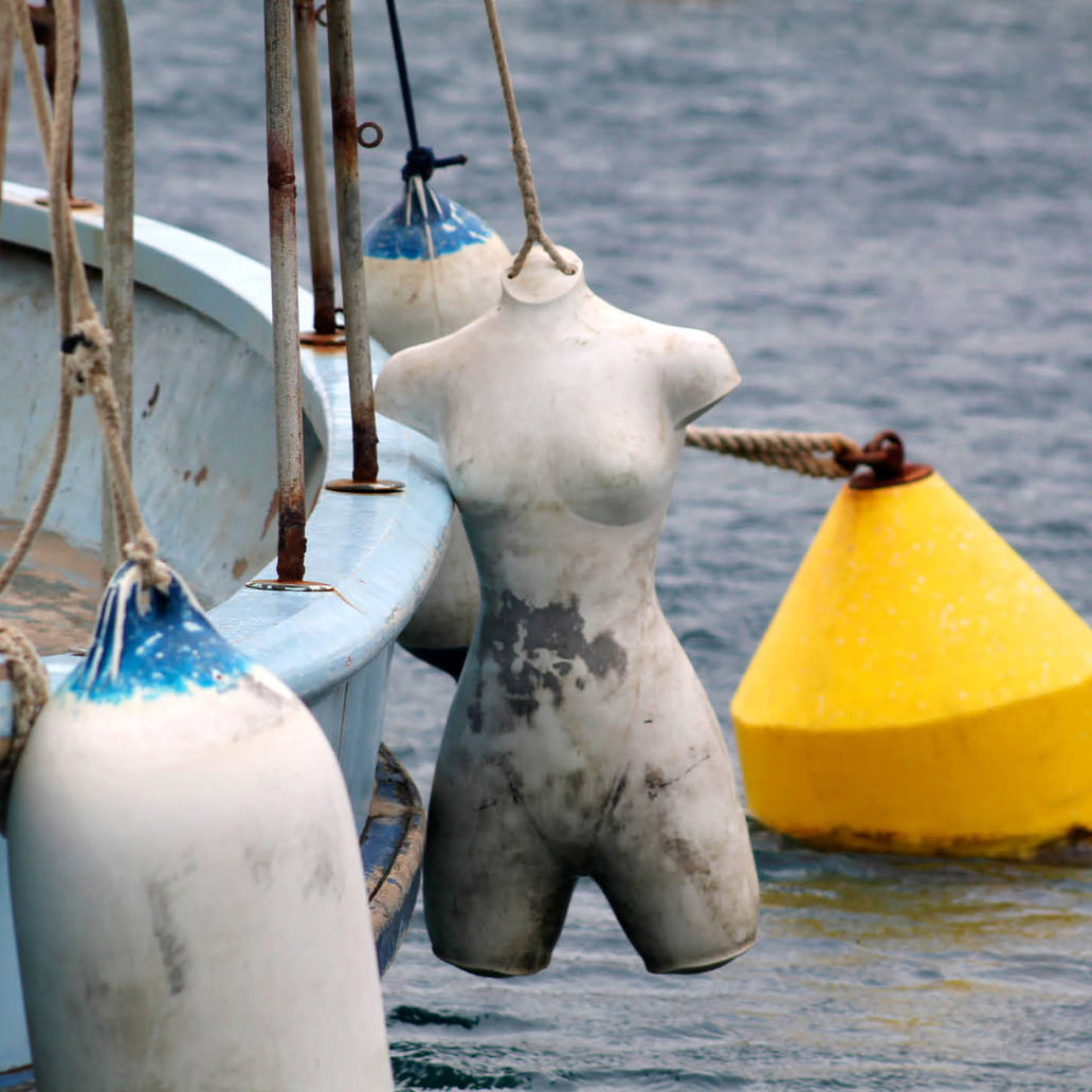 Dieser Fischer fügt unbekümmert eines zum anderen. Er scheut sich nicht, die Plastik-Schaufensterpuppe ihrem eigentlichen Zweck zu entfremden und sie mit seinen eigenen Anforderungen zu kombinieren. Schamlos und ungeniert nutzt er die Vorzüge der Puppen und setzt sie pragmatisch als Bootsfender ein – wofür sie sich anscheinend hervorragend eignen –