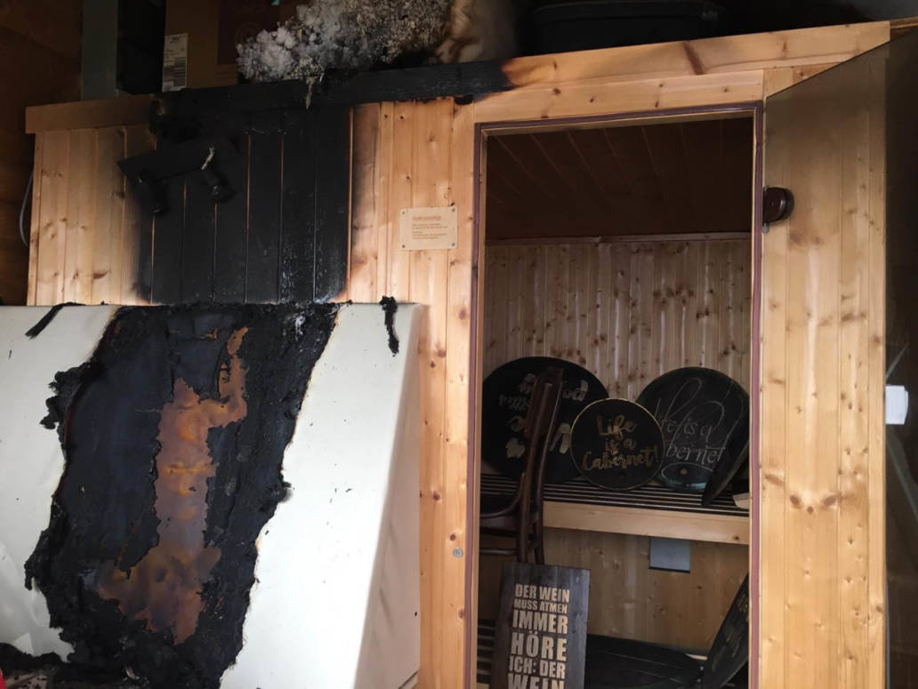 Wenige Tage danach brach in der Sauna Feuer aus. Vermutlich wegen Sauerstoffmangel erlosch das Feuer jedoch von selbst.