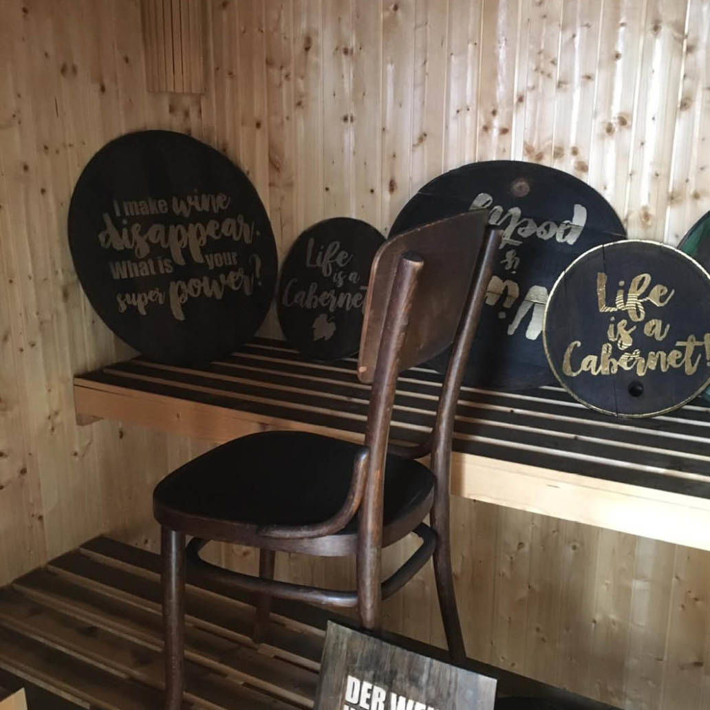 Acht Fassdeckel, bzw. Fassböden und ein Poetry-Board wurden in einer Sauna der üblichen Holzwurmbehandlung unterzogen. Die Exponate wurden in der Sauna gelassen um dort abzukühlen.