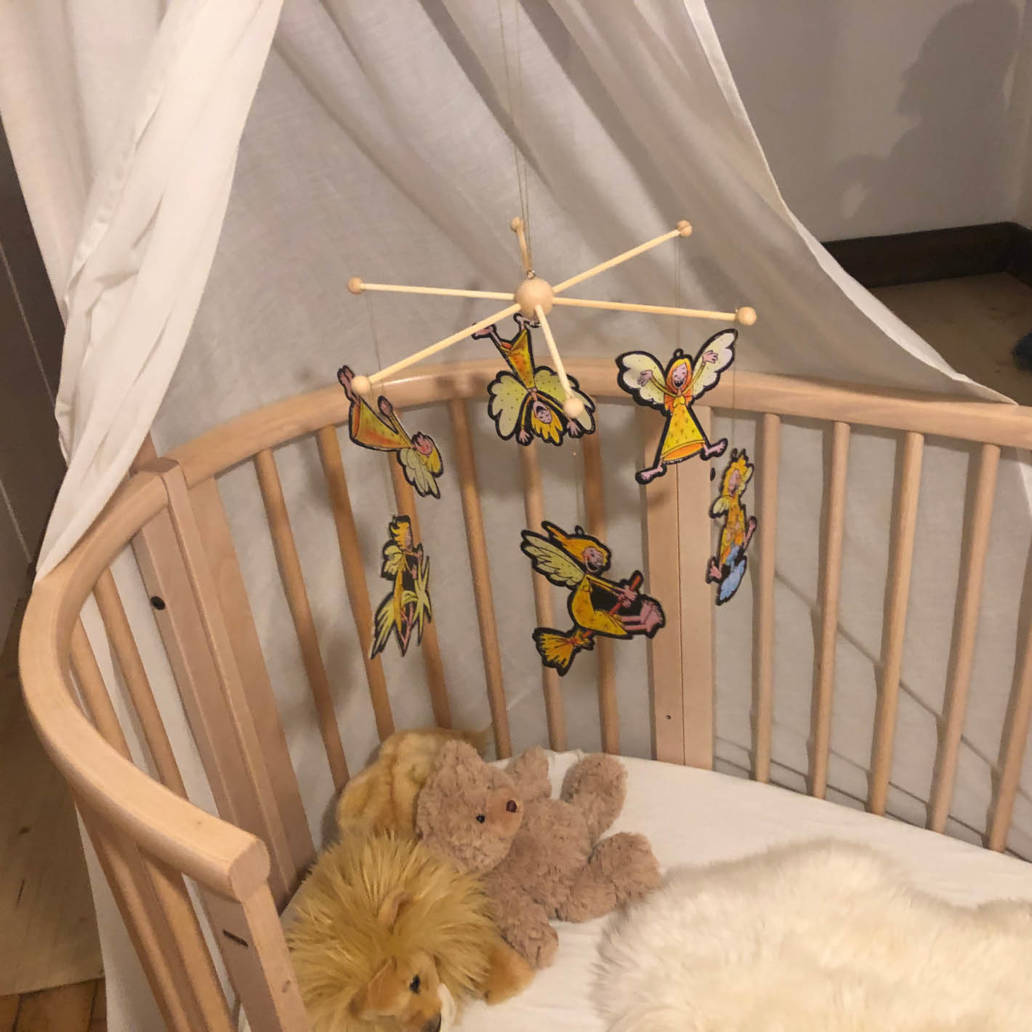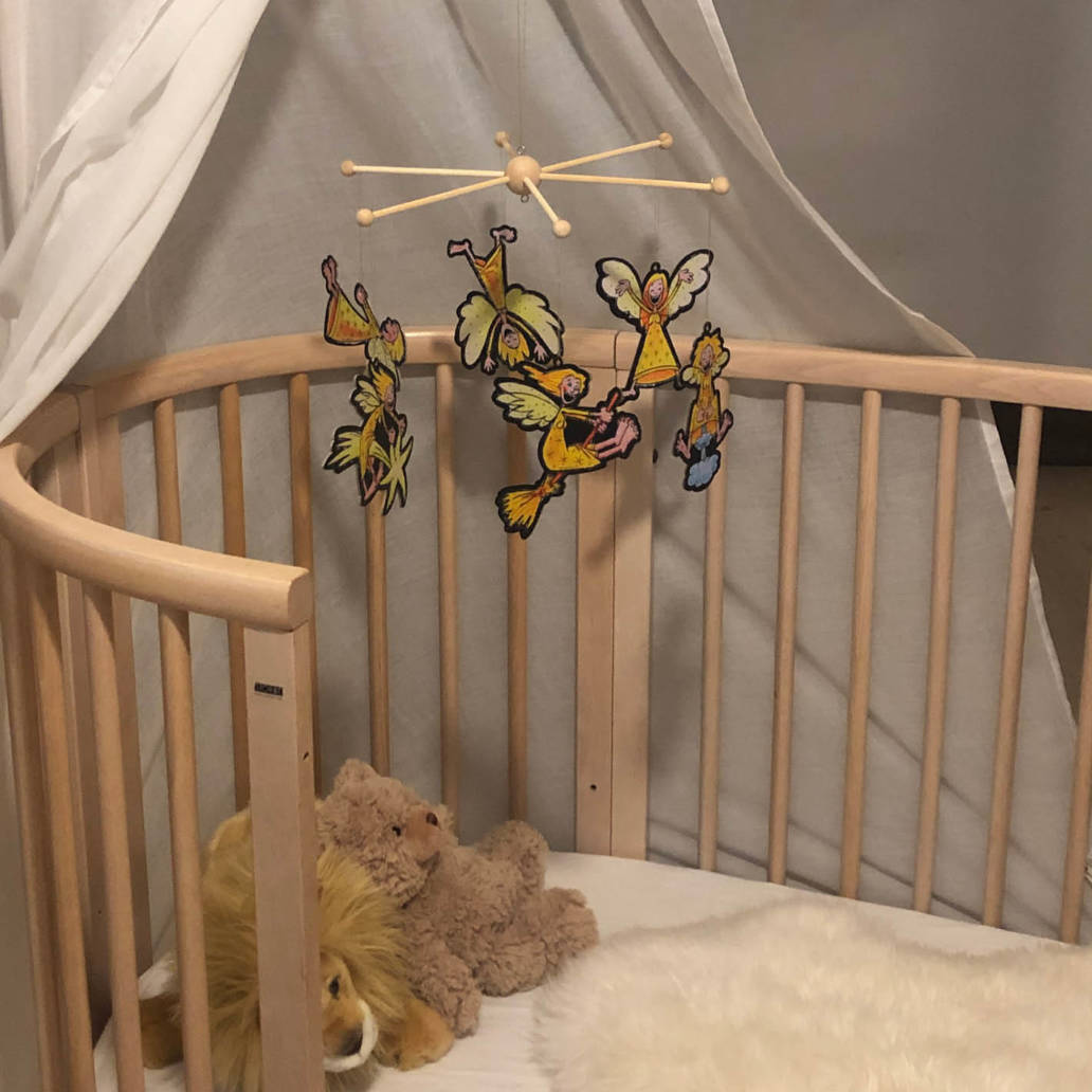 Ein paar liebe Menschen haben mit Gerti ein Mobile für ihre kleine Tochter gebastelt. Das hat ein wenig gedauert, bis sie gewußt haben, welche Gerti wie viel wiegt – damit das Mobile im Gleichgewicht bleibt und keine abstürzende Engelsschar daraus wird. Natürlich hätten sie jeweils zwei gleiche Gertis gegenüber hängen können, aber das wollten sie nicht.